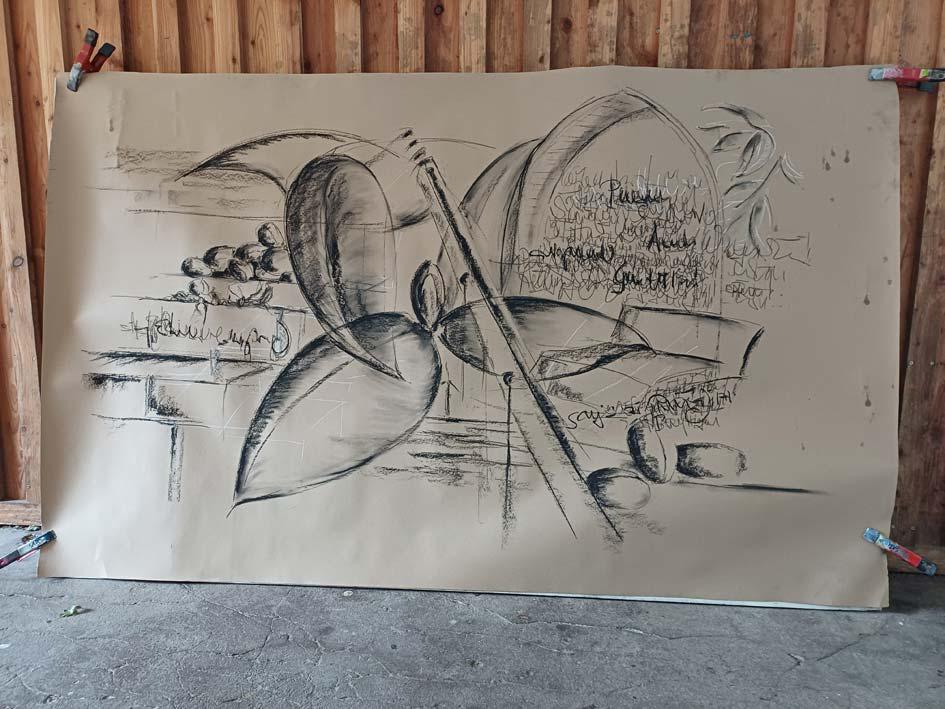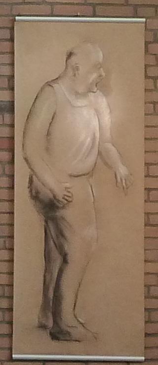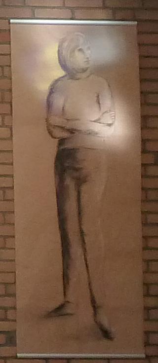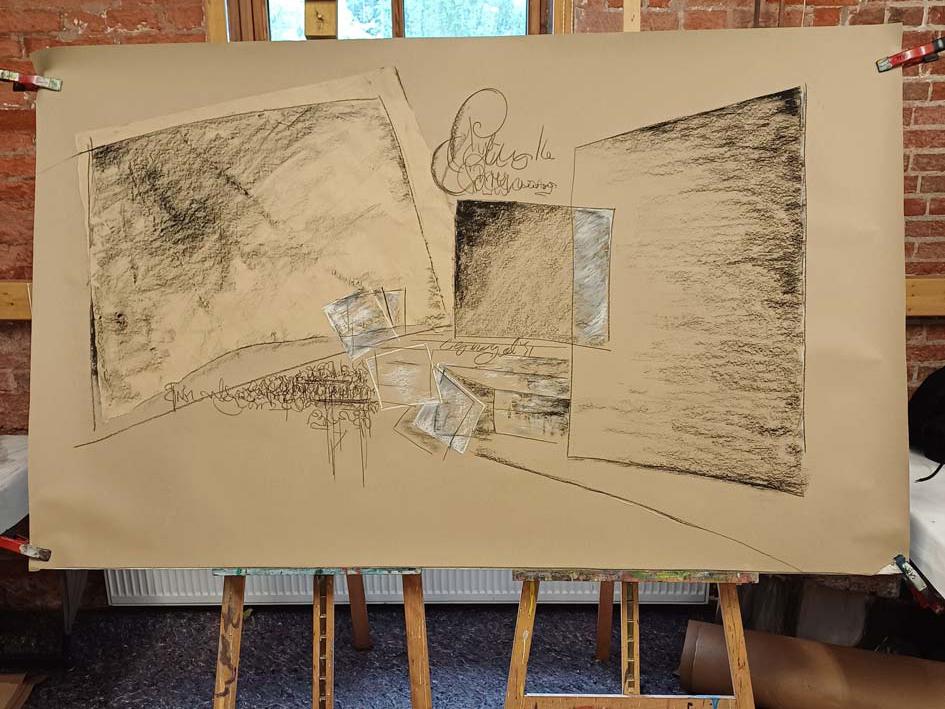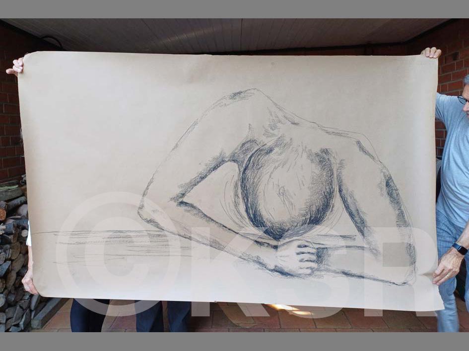 Für Zeichnende sind Formate zwischen kleinen Postkartenmaßen und 50x70 cm "normal" - das ist bei mir auch so. Zwischendurch wage ich mich aber an Größen, die nicht so üblich sind - 70x180 cm haben die beiden stehenden Figuren (2022); die Querformate sind über zwei Meter breit (2023).